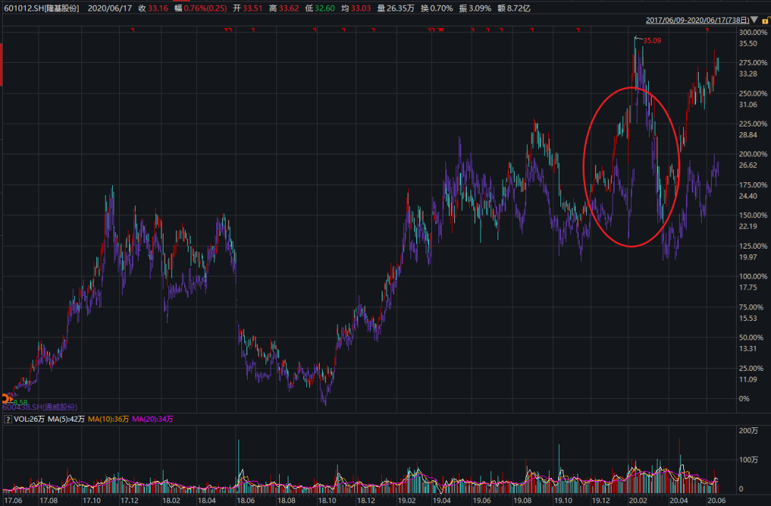 典型的比如隆基股份和通威股份,这两个光伏的龙头,自2017年以来,基本上同涨同跌,在今年2月份的时候隆基的涨幅显然大大跑赢通威股份,但是这个差距只用了一个月的时间就通过通威的暴涨被消灭,当然现在两只股票的走势也出现大的分野,但我们总体上还是认为这种走势的差别最后会消失。