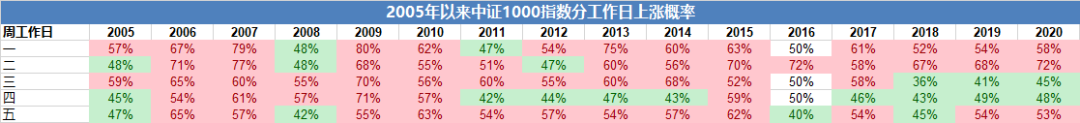 各个工作日指数的表现也有一些规律。我们列出了从2005年以来,中证1000指数分工作日的上涨概率,非常明显的是,周二上涨的概率很大,而周三周四下跌的概率则相对较大。也就是说,如果想要调仓,周二卖出,周三四买入,长期看调仓的成本要小一些。