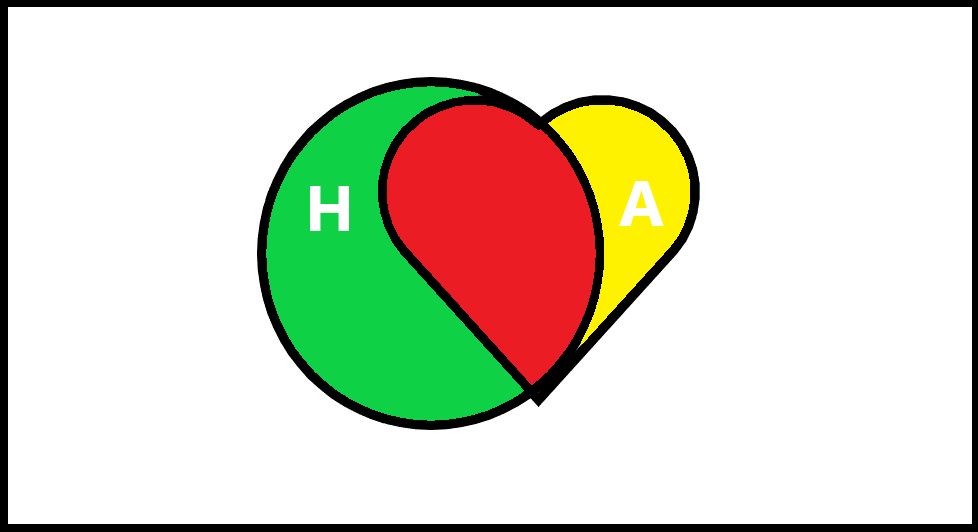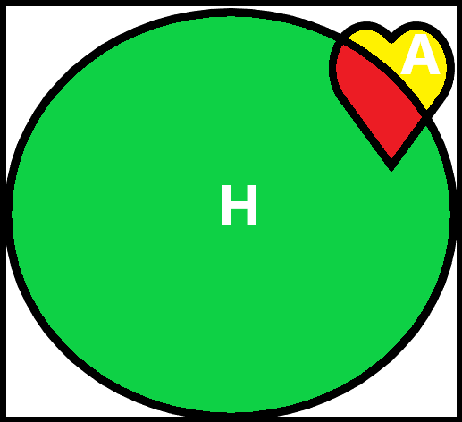 换一个角度理解,似然估计的意义是评估H因素在总体的影响力,在A中是不是得到强化了。我们研究A这个心形,发现其中重合部分的H占到的比例超过二分之一,看上去H非常显著,但我们怕出现上图的情况。