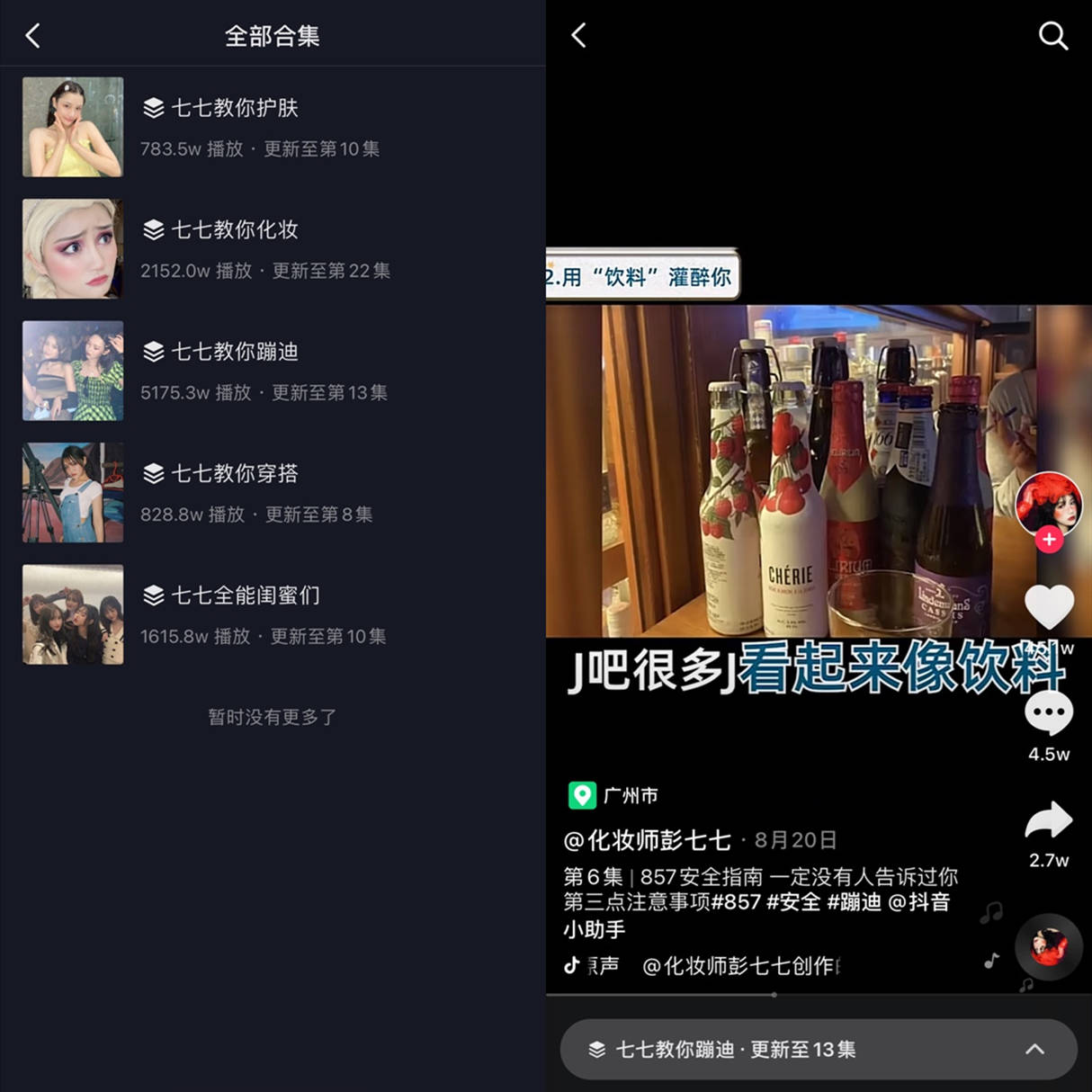 在蹦迪合集里,彭七七演示了怎么玩骰子、怎么做基础的摇摆动作、怎么规避被灌酒的风险,“贴心姐姐”的形象一目了然。再搭配她的老本行,妆容、穿搭一步到位,蹦迪菜鸟可以跟着上手,也让各类“恰饭”植入无比自然。