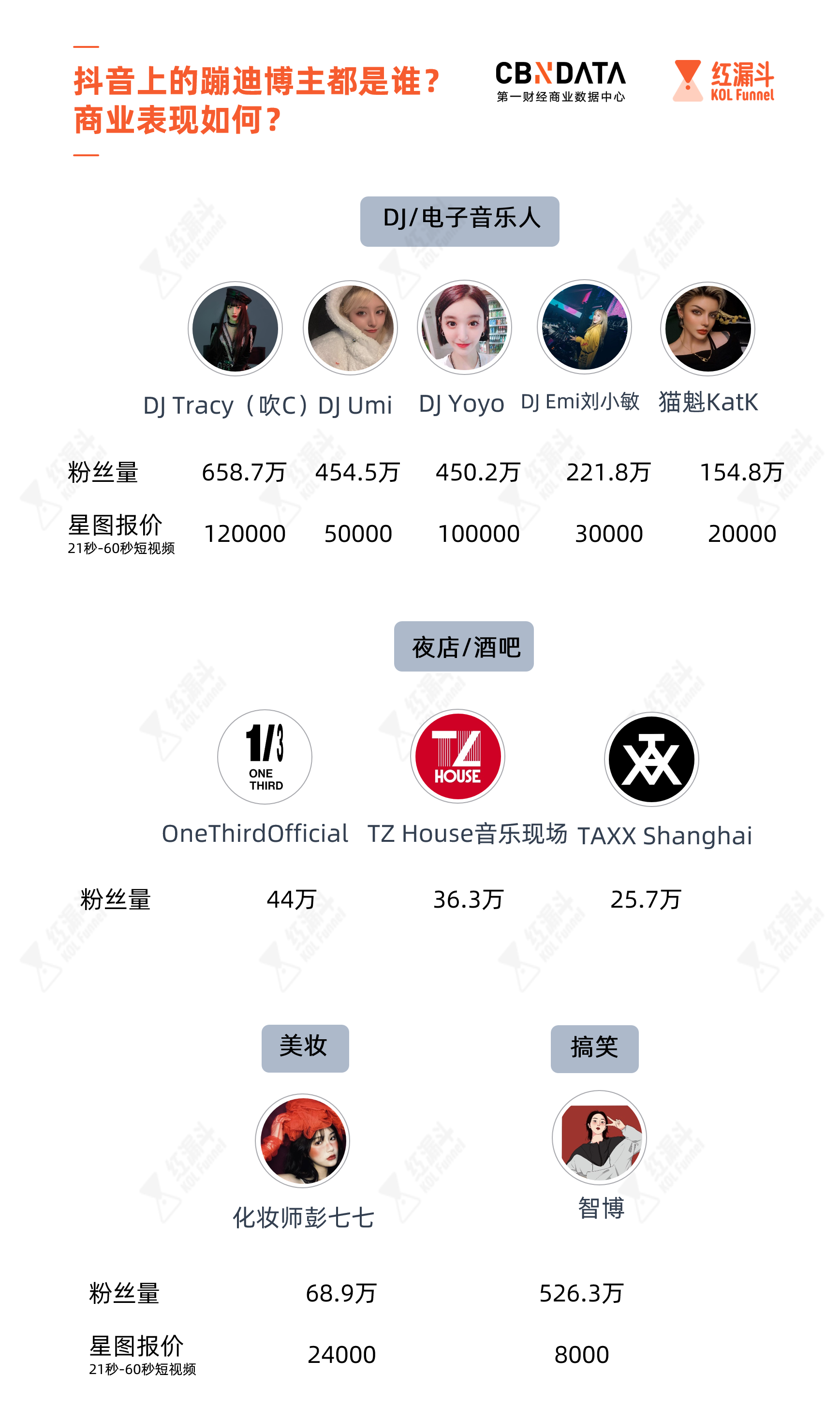 尽管抖音上的各路蹦迪博主身份不同、商业化表现不一,但选题方向却出奇一致。