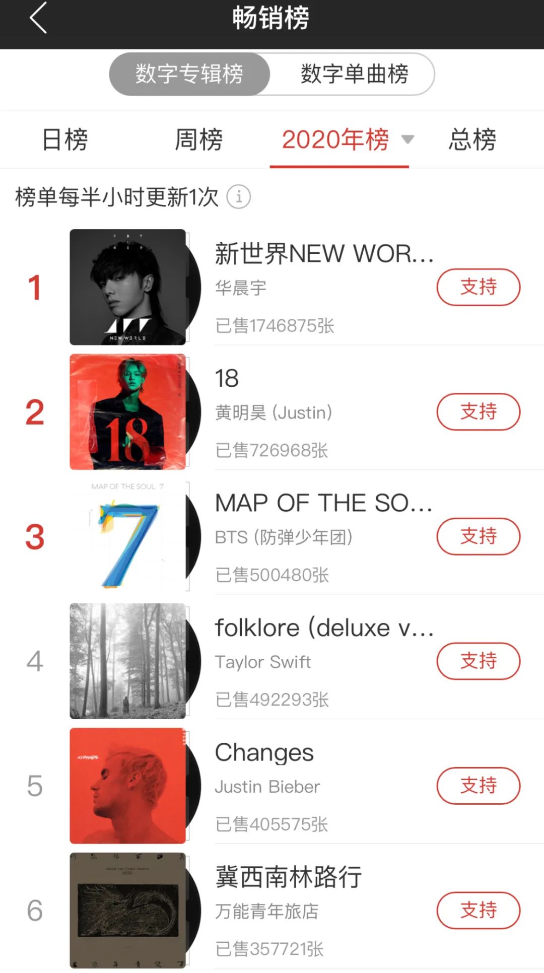 网易云音乐数字专辑年榜上,排在前十的除了万青,还有华晨宇、黄明昊、BTS、Taylor Swift、Justin Bieber等
