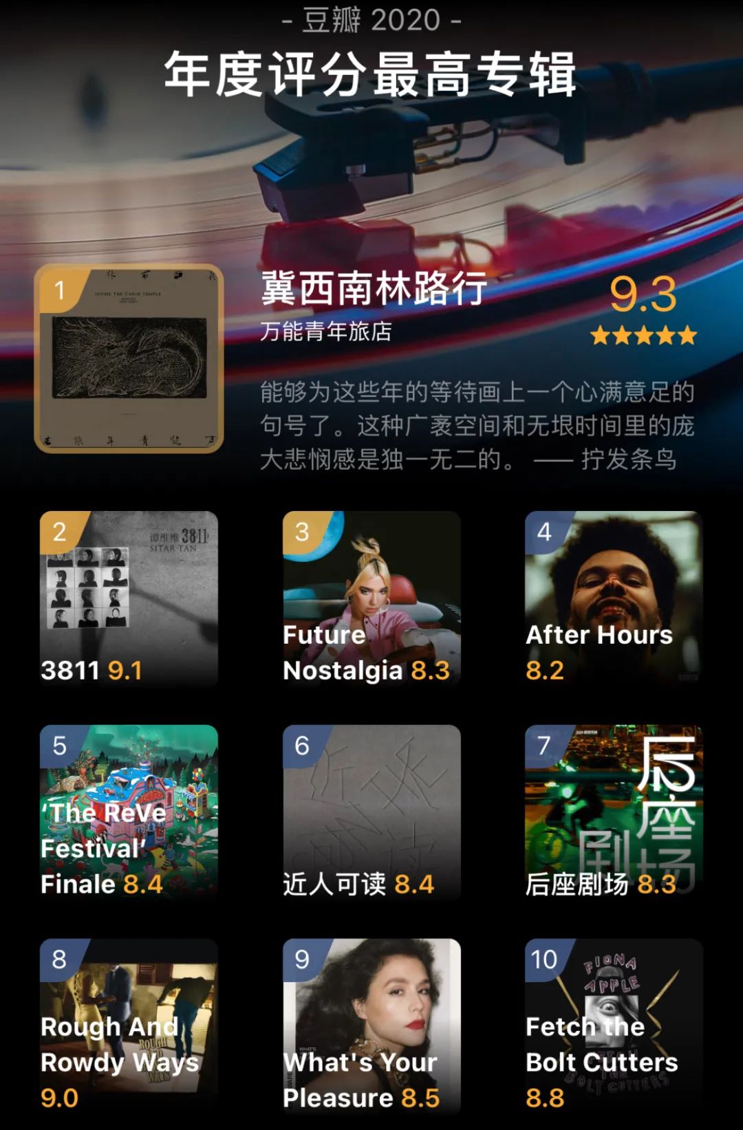 截止目前,《冀西南林路行》以9.3的评分拿下了豆瓣年度音乐榜单年度评分最高专辑,在网易云音乐销量突破35万张,并成为了网易云音乐2020年数字专辑榜上销量第六的作品。