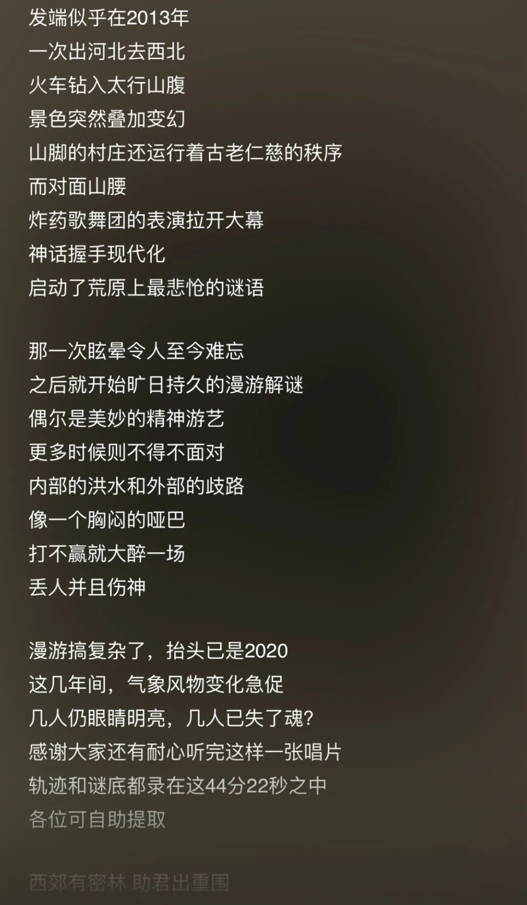 这张专辑便是谜底,是十年里万青对时代变迁与个体命运的再一次思考。晦涩的歌词,让《冀西南林路行(专辑全长)》的乐评区聚集了很多延展性的解读,有人认为从《早》到《郊眠寺》,是自然界从独自美好到被人类改造,再到成为赛博世界的象征,有人则觉得是个人成长过程与社会变革的缩影,这些或许都是《冀西南林路行》的表层及深层表达。