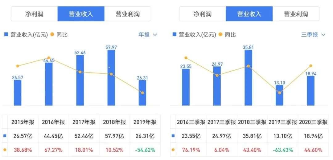反映到财报数据上,2015年-2018年,华策的营收一直保持上涨态势,其中2016年的增速最快,达到67.27%。而那一年,《亲爱的翻译官》《锦绣未央》《微微一笑很倾城》都是年度热剧。但在之后,华策的年度营收增速逐年降低,2019年,更是骤降54.62%至26.31亿。到了2020年,尽管其营收呈现出上涨态势,但较峰值时的2018年相比,已是几近腰斩。