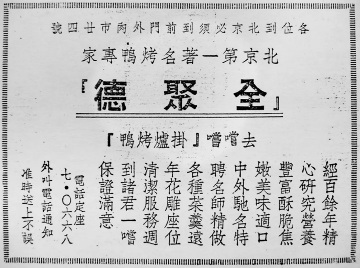 一本1950年出版的旧书里曾记录了全聚德最早的文字广告。其中不仅有对全聚德从区位、工艺、菜品到品牌地位的宣传介绍,还附有送鸭上门的“订餐热线”,以及“准时”、“不误”的服务承诺。