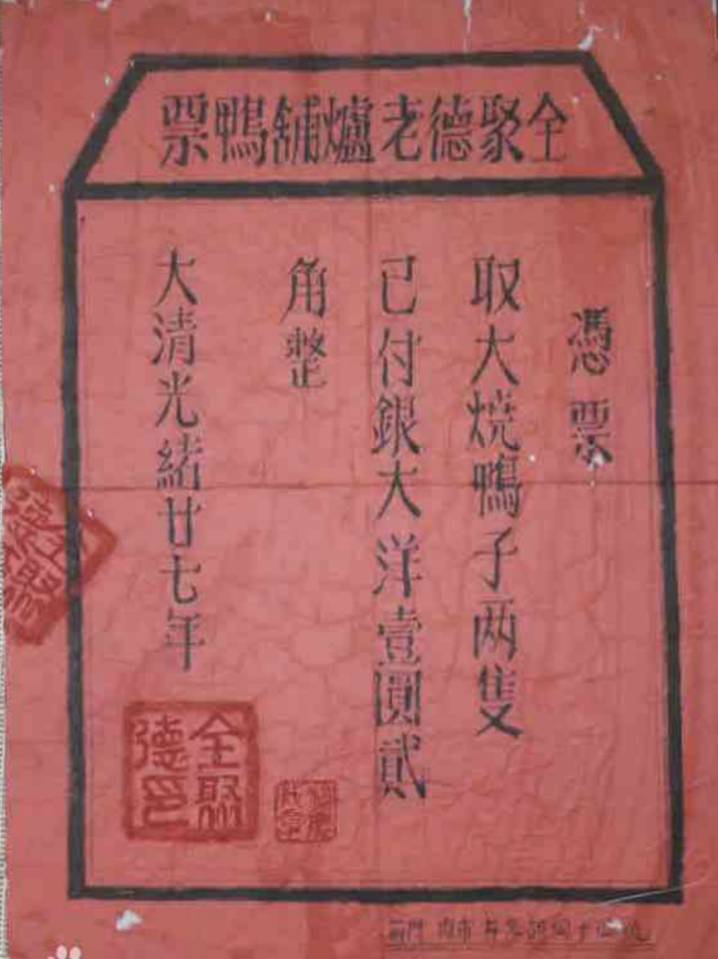 早在同治、光绪、宣统年间,全聚德就开始发行“鸭票”,类似于今天的月饼券。鸭票用红色宣纸印制,长方形、上边切去两角。抬头印有“全聚德老炉铺鸭票”八字,票据内容为:取大烧鸭子两只,已付银若干。