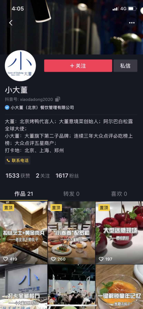 总结来看,大董的品牌营销更偏线下实体,营销聚焦,但线上却做得相对简陋。大董的官网建设停留在2016年,微博粉丝勉强过万,在B站、快手暂无帐号运营。抖音帐号虽然有24万粉,但点赞数大多只有两位数。
