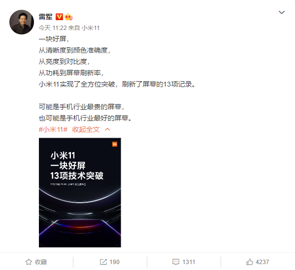 作为小米新十年新征程的第一款产品,小米11成为目前市面上最受关注的一款产品之一,不仅仅是因为它全球首发骁龙888处理器,更是以为它在其他硬件配置上也有大幅度升级。近日,小米CEO雷军就在微博上公开表示,小米11所采用的屏幕可能会是市面上最为昂贵的一块。