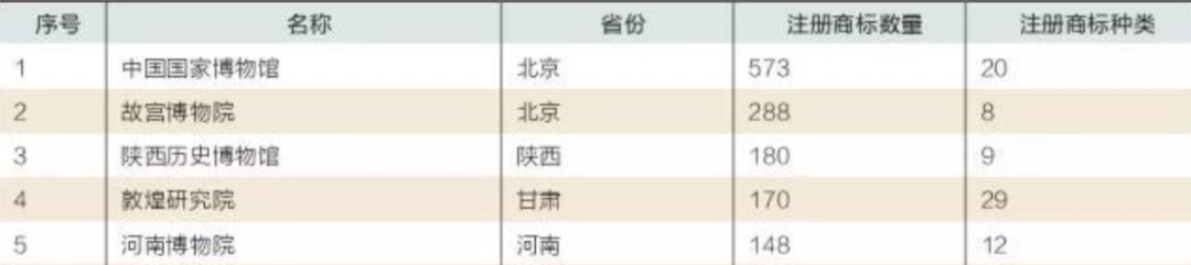商标注册也是行之有效的保护方式,博物馆的文创产品不但要积极申请注册相应商标,还应有意识打造驰名商标。商标的申请虽然时间较长(大致需要一年左右),但博物馆在申请相应商标时优势也会比较明显,不少时候还能实现“后发先至”,毕竟那些大名鼎鼎的宝贝文物都由他们保管。当前很多博物馆都很重视商标的申请工作,截至2017年6月,我国的一百多家国家一级博物馆在中国商标网上已经注册的商标就有将近3000种,排名前五位的是: