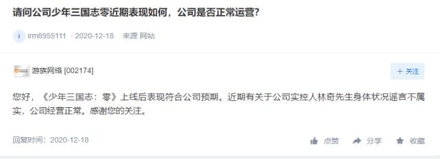 值得一提的是,12月18日,有投资者在互动平台询问公司少年三国志零近期表现以及公司是否正常运营时,游族网络回应称:“《少年三国志:零》上线后表现符合公司预期。近期有关于公司实控人林奇身体状况谣言不属实,公司经营正常。”