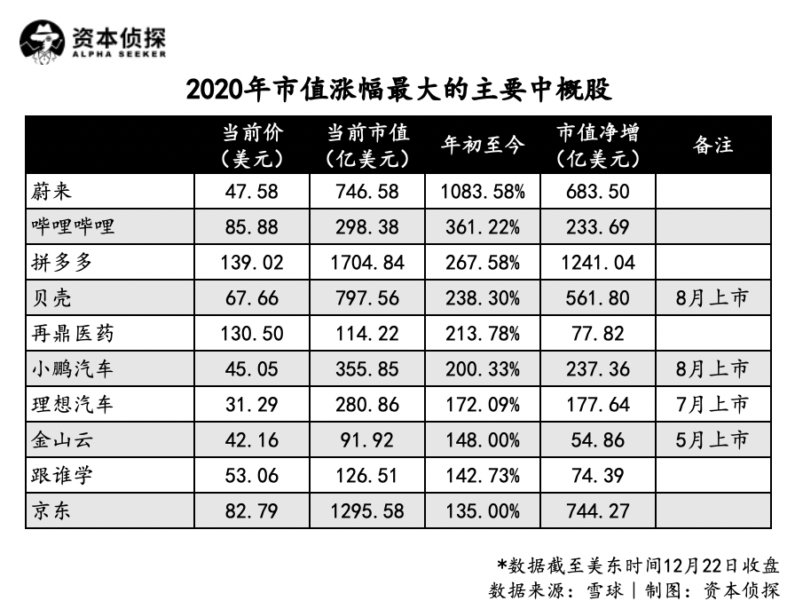- 美股蔚来一年涨幅超过10倍,拼多多翻了近3倍,一跃成为市值规模仅次于阿里巴巴的中概股互联网企业;