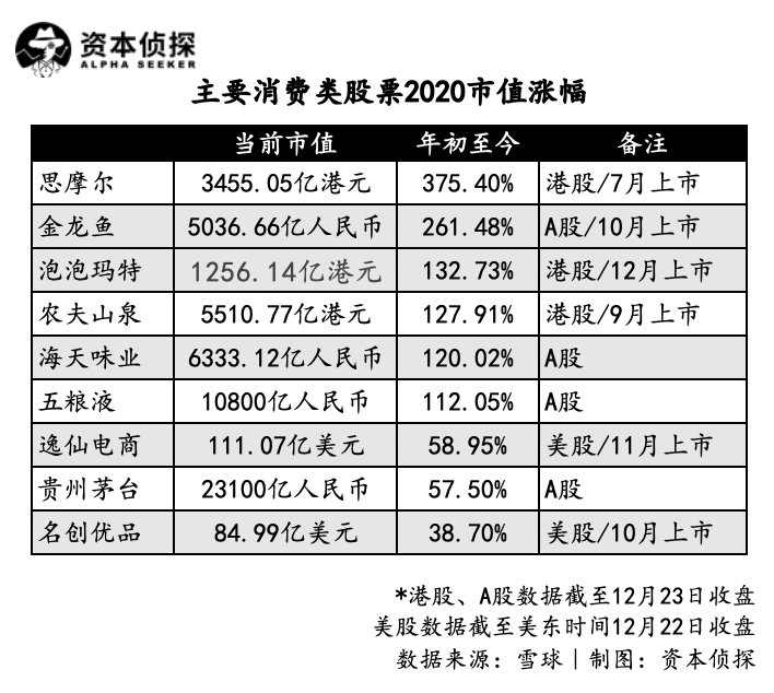 A股则偏爱国民品牌,无论是金龙鱼、海天味业,还是五粮液、茅台,都是家喻户晓、与日常饮食生活息息相关的消费品牌。在这些品牌中,茅台可谓A股的大霸主,今年伴随着白酒板块普涨的趋势,茅台也不断创下新高,市值已达到2.3万亿人民币。