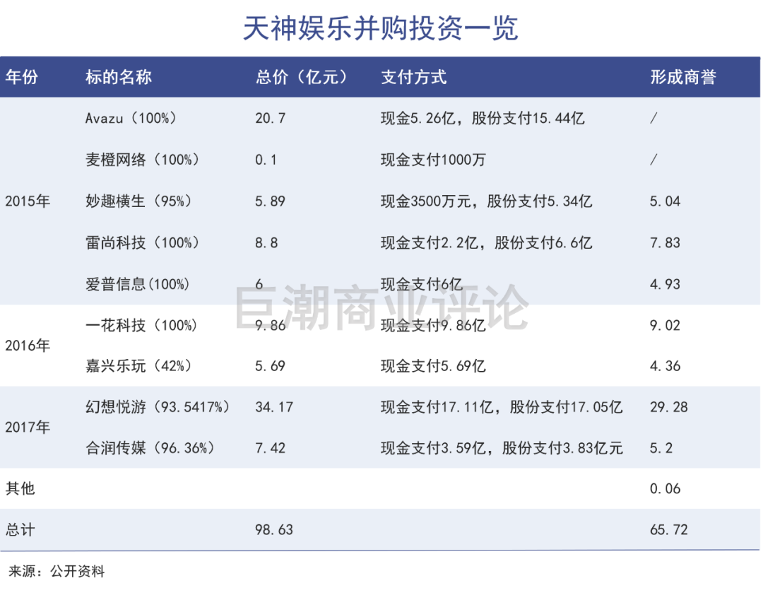 相比游族,天神娱乐的“泛娱乐”战略步子更大,手法也更加激进。从2015年开始,这家公司就发起了不间断的大规模激进并购,仅上市公司直接并购的就有9家公司,包括了手游、休闲游戏、影视、数字营销等等,累计斥资68.28亿元,其中以现金方式支付的金额就超过50亿元。