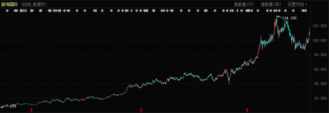 这推动了颐海国际的股价自2018年之后一路上涨,从7.5港元上涨至最高134.1港元,涨幅高达十余倍。这样的市场表现,超越了同时期绝大多数中国上市公司。