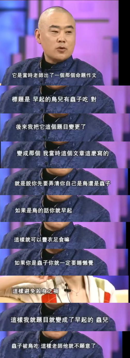 仍是小学生时,郑渊洁将原本的作文题目从《早起的鸟有虫子吃》变成了《早起的虫子被鸟吃》,却遭到老师嘲讽“渊博的名字下其实很无知”,让他当着全班同学重复一百次“郑渊洁是全班最没出息的人”。无法忍受的郑渊洁,一气之下引爆了身上藏着的拉炮。