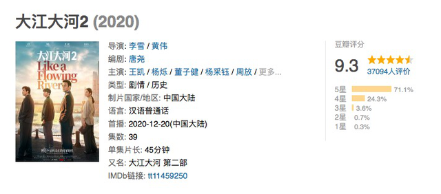 如无太多意外,《大江大河2》应该会是2020年度最佳口碑剧集:岁末最后10天超越《沉默的真相》的豆瓣9.2分,该剧以豆瓣开分9.4分,如今剧集更新近三分之一评分仍然稳稳落在9.3分,好评率超95%的成绩,后来居上,抢占豆瓣剧集口碑榜TOP1。