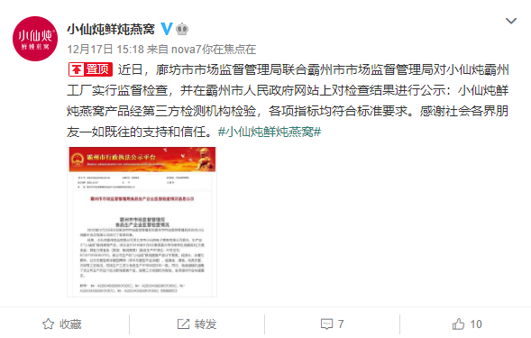 面对多次质疑,小仙炖方面至今仍未正面给予任何回复,只是在近日将廊坊市市监局联合霸州市市监局对小仙炖霸州工厂的监督检查结果进行了微博置顶。