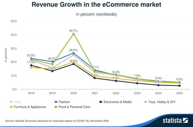 让我欣喜的是,从10月份开始,疫情改变了一些人的消费行为和购物方式,跨境电商反而“起死回生”了。从Statista的数据来看,全球跨境电商的利润增长率在今年飙升到一个新的高点,但此后又将跌回理性状态,且有逐年降低的趋势。