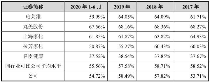 而这,进一步影响到公司的盈利能力。如下图所示,2017年-2020年上半年,仙迪股份毛利率分别为53.71%、57.82%、58.49%和 54.72%,明显低于珀莱雅、丸美股份及上海家化等同行可比上市公司同期毛利率水平,甚至低于主营日化产品的拉芳家化。