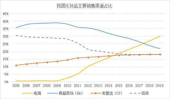 实际上,相对于国外品牌而言,国产化妆品的一大核心竞争力就在于渠道结构的多样。由于外资品牌线下渠道布局较早,优势相对突出,线上渠道就成为国产品牌发展的重中之重。2018年以来,电商渠道已经超过商超卖场成为化妆品行业第一大渠道,2019年市场份额超过30%。
