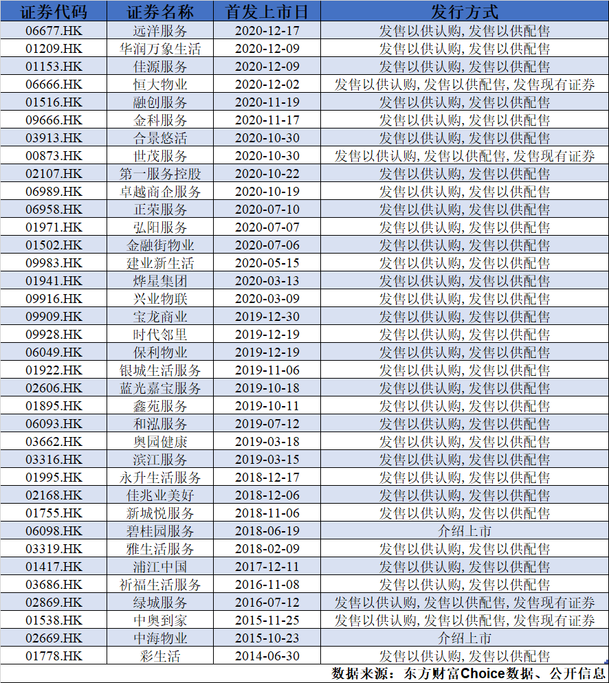 东财Choice数据显示,目前港股市场上的36家内地物业管理上市公司中,采用介绍上市的的物管企业仅两家,分别为2015年上市的中海物业、2018年上市的碧桂园服务;其他34家公司则通过发行新股上市。