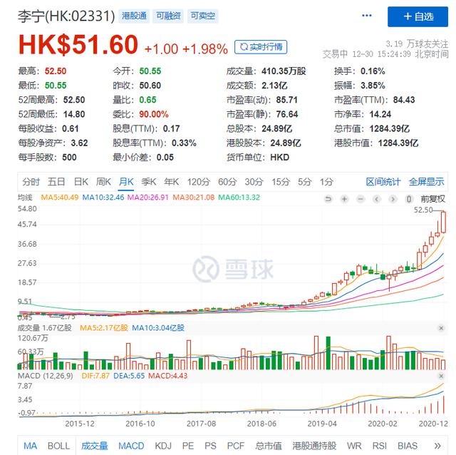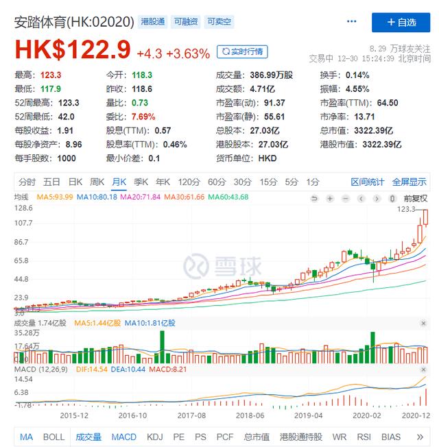 不过随着疫情逐步受控、消费逐步复苏,这一板块似乎迎来了一些转机。12月28日,体育用品股李宁涨超3%,安踏涨超2%,二股齐创历史新高。截止发稿,李宁报51.6港元,涨1.98%,安踏报122.9港元,涨3.63%。高盛也重新对中国运动服饰市场预期作调整,行业春天似乎已经临近。