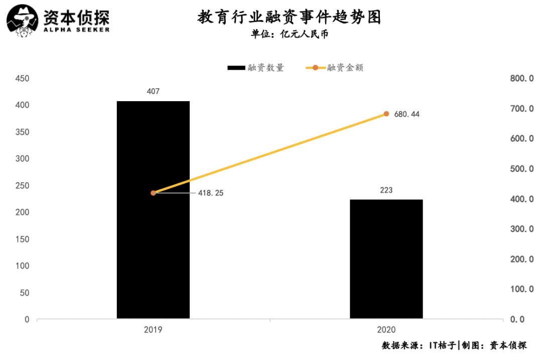 - 据IT桔子数据统计,截至12月17日,2020年教育行业共发生了223起融资事件,相比于2019年407起,数量降超四成;