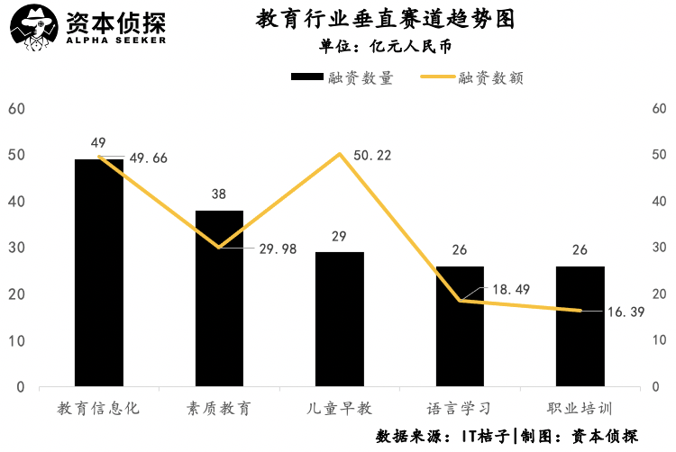 从获得融资企业的数量来看,排序又有不同:教育信息化最多为49家,素质教育为38家,儿童早教为29家,随后是语言学习和职业培训都为26家。能够看出,教育信息化资本活动颇为频繁,但整体发展还处于早期阶段。