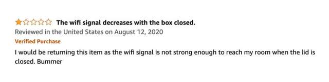最搞笑的是,路由器放进去之后,就像人进入电梯手机信号会变差一样,Wi-Fi信号直接无法传输到手机和电脑设备上了,导致购买者网速下降或者根本连不上网,于是他们纷纷在亚马逊上给出了一星差评,认为笼子不应该影响网速。