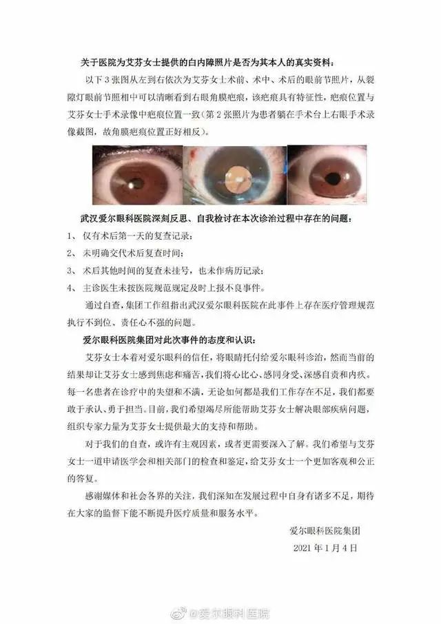 2021年1月2日,爱尔眼科医院官方微博消息,对于艾芬在武汉爱尔眼科医院的眼病诊治事件,爱尔眼科医院集团迅即成立集团调查工作组,并于2021年1月1日连夜赶赴武汉进行调查。