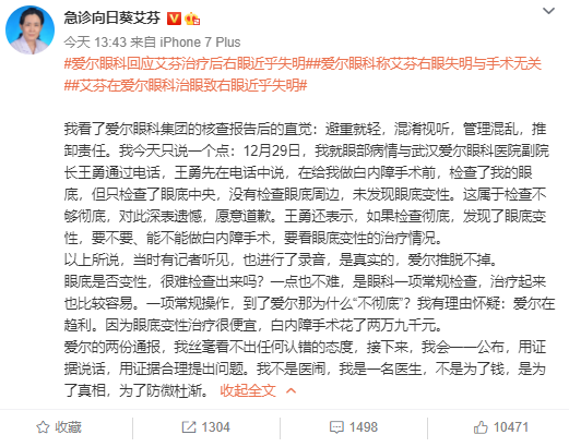对于爱尔眼科的核查结论,艾芬在微博中回应表示,该报告避重就轻,混淆视听。艾芬怀疑,爱尔眼科常规检查之所以"不彻底",是因为"因为眼底变性治疗很便宜,白内障手术花了2万9千元。"