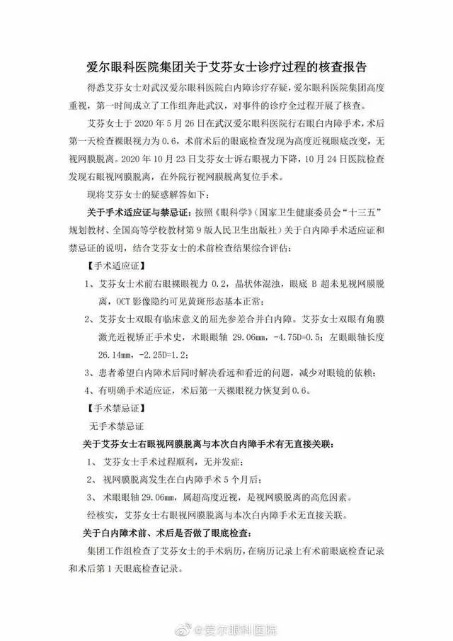 1月4日,爱尔眼科官微发布了"爱尔眼科医院集团关于艾芬女士诊疗过程的核查报告",报告结论称,艾芬右眼视网膜脱离与本次白内障手术无直接关联。并且给出的原因为:一是艾芬手术过程顺利,无并发症;二是视网膜脱离发生在白内障手术5个月后;三是术眼眼轴29.06mm,属超高度近视,是视网膜脱离的高危因素。