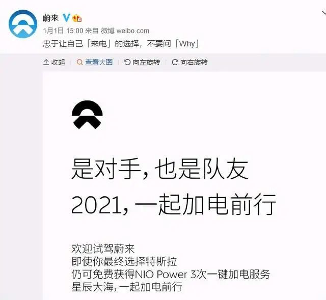 1月1日下午,蔚来官博发布了一条"忠于让自己'来电'的选择,不要问'Why'"的博文,在下方的配图中表示,"是对手,也是队友。2021,一起加电前行"。蔚来还给出了额外优惠政策,"欢迎试驾蔚来, 即使最终选择特斯拉,仍可免费获得NIO Power 3次一键加电服务。"