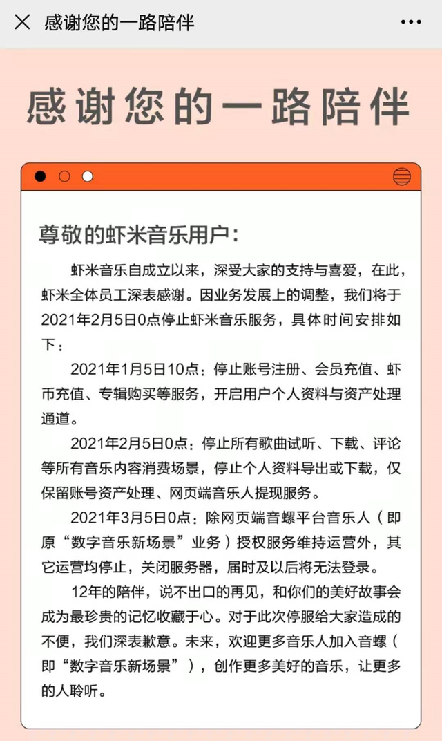 告别信显示,1月5日10点,虾米音乐将停止账号注册、会员充值、虾币充值、专辑购买等服务,开启用户个人资料与资产处理通道。