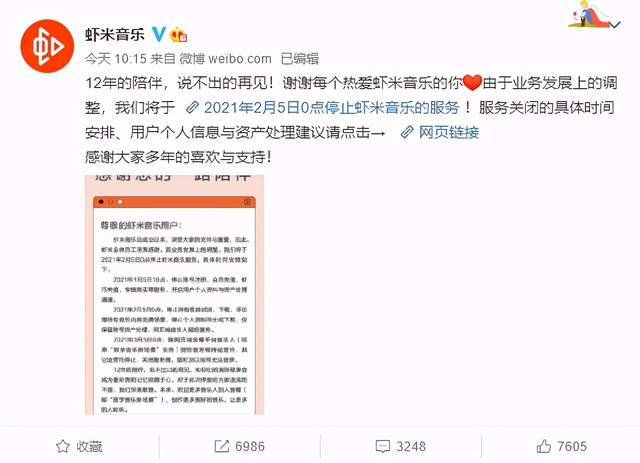 “12年的陪伴,说不出口的再见。未来,欢迎更多音乐人加入音螺(即‘数字音乐新场景’),创作更多美好的音乐。”在信的最后,虾米音乐写道。