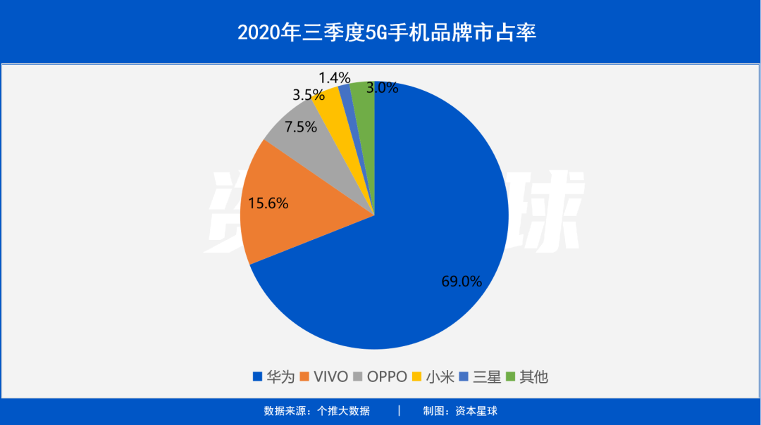 而在5G市场的争夺上面,小米也不占优势。2020年三季度数据显示华为以69%的占有率遥遥领先,第二三名是VIVO和OPPO,小米市占率仅3.5%,这一数据可以从侧面证明技术积累对于一家手机企业的重要性。