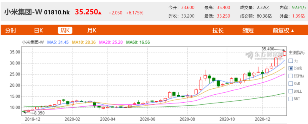 自2020年1月起小米股价开始呈现波动上升态势,1月3日收盘价仅为10.9港元,到了今年1月4日这个价格变为35.26港元,一年内翻了三倍。