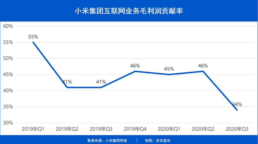 另一方面,互联网服务的毛利润贡献率也有所下降,2020年三季度小米互联网服务业务的毛利润贡献率为34%,环比下降了12个百分点。