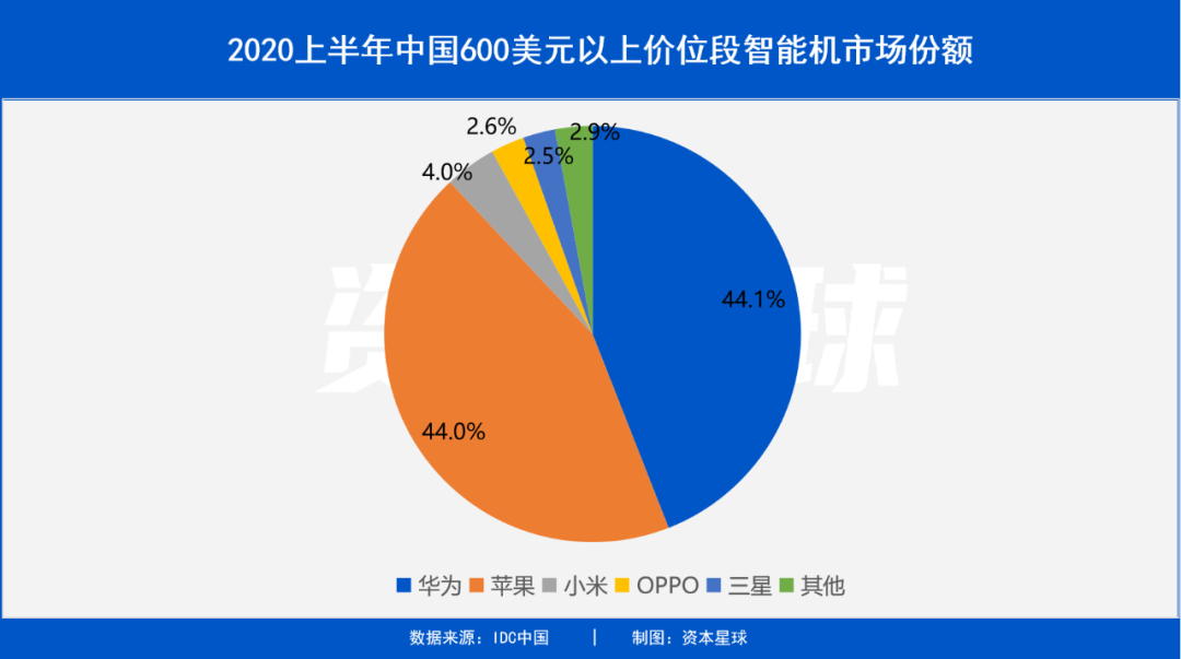 据IDC公布的数据显示,2020年上半年中国600美元(约合人民币3800元)以上价位段智能手机中,华为以44.1%的份额排名第一,苹果以44%的份额排名第二,二者相加占据近九成市场份额,小米仅占4%市场份额。