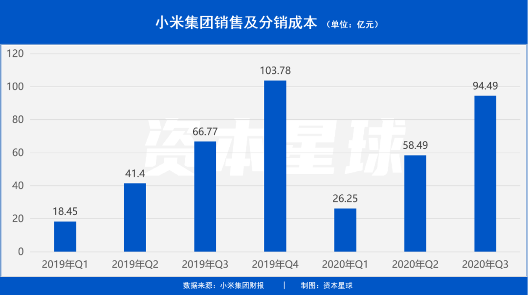 或许是自知在技术上处于劣势,小米近些年在营销上可谓煞费苦心。财报显示,2019年至今,小米手机的销售及分销成本波动上升,2020年三季度销售费用94.49亿元,较去年同期大幅增长41.5%。这几年小米还聘请了吴亦凡、王源、王一博、古力娜扎等顶流明星,代言费和广告费想不在少数。
