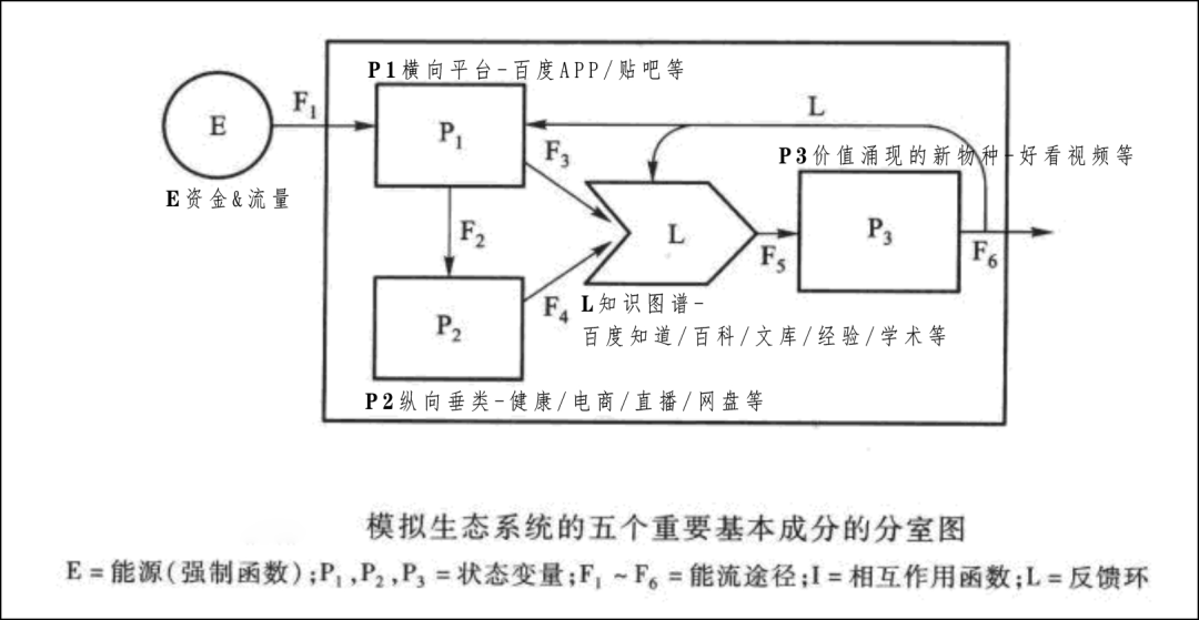 我们用生态学里的箱式生态模型来简要拆解,方便理解百度的移动生态各个产品线之间的关系以及互相之间的协同效应: