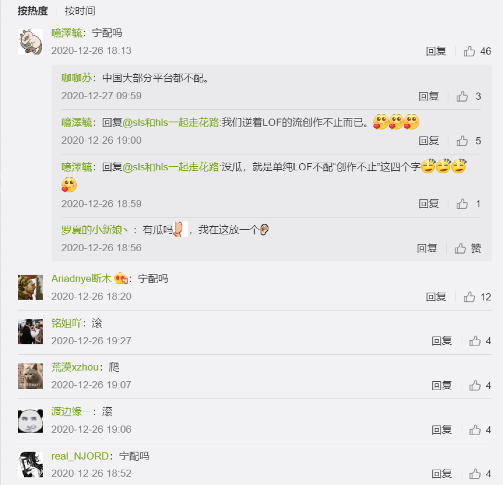 之所以对其战略有这样的推测,在于LOFTER用户与平台的关系有了明显的变化。2020年12月26日,LOFTER的官方微博发布了两条与品牌焕新发布会相关的视频,其中一条是“世界逆流而上,我们创作不止”,评论区的画风是这样的:“宁配吗”、“我们逆着LOF的流创作不止”……