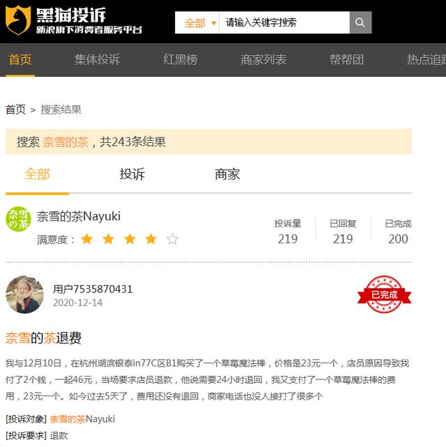 第二, 奈雪的茶靠“健康、天然茶叶”标签吸引了不少年轻奶茶友们,但在这些标签却开始反噬自身,其奶茶安全问题频发开始受到市场质疑。据黑猫投诉数据显示,截至目前,有关奈雪的茶投诉消息达219条,投诉内容集中食品安全存在问题,服务态度不佳以及退费难等。