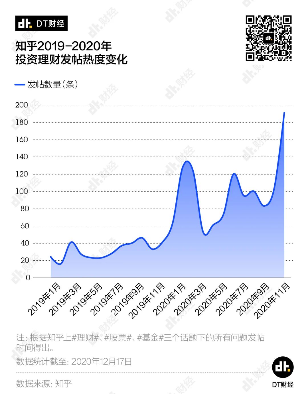 从时间线来看,年轻人对于投资理财的关注度确实在一路走高。2020年的理财氛围比2019年更浓厚,知乎发帖量同比增长215%。今年的2-3月、7月以及12月都有着阶段性的小高峰。