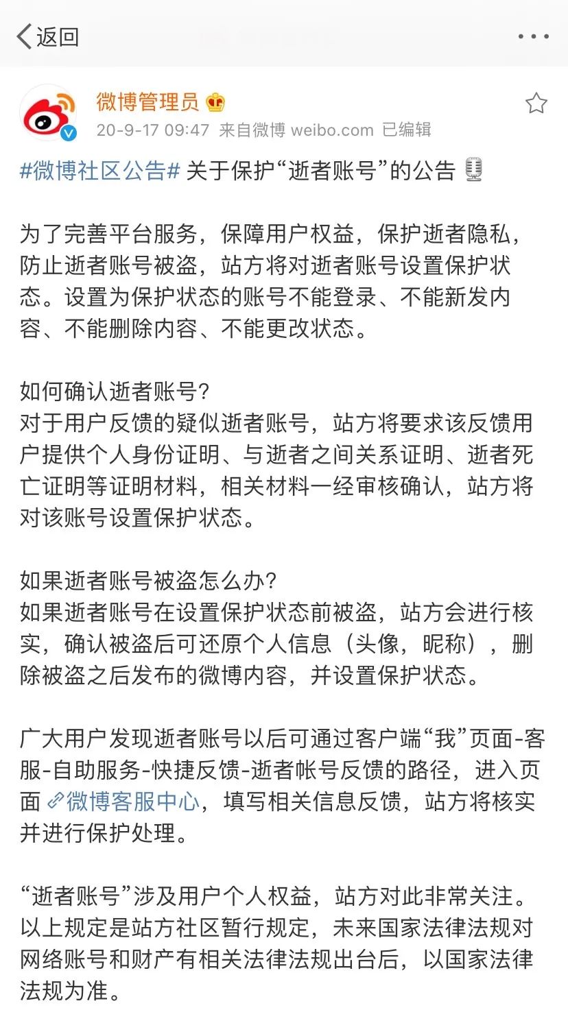 新浪微博也曾于2020年9月17日发布公告称,将对逝者账号设置保护功能——不能登录、不能新发内容、不能删除内容、不能更改状态,从而完善平台服务,保障用户权益,保护逝者隐私,防止逝者账号被盗。