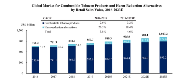 电子烟作为传统可燃烟草制品的替代品,一直被外界视为极具发展潜力的新兴消费行业,在全球范围内发展迅速。据CIC报告。2019年,全球可燃烟草产品和减少危害替代品的零售总额为8507亿美元,预计2023年将达到10172亿美元,其中,2019~2023减害替代品复合年化增长率约为18.4%。
