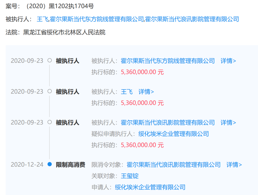 或是受此影响,*ST当代旗下的一些院线公司开始陷入股权转让纠纷。其中,企查查显示的最新一条法律纠纷处理结果为,当代东方院线和当代浪讯影院涉及执行金额达到536万元,后者负责人王玺锭已被限制高消费。