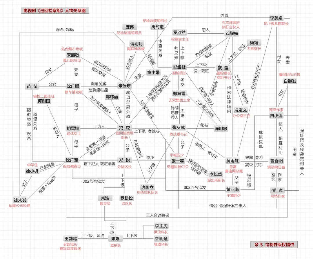目前观众在市场中看到的《巡回检察组》,是一个基于检察官冯森妻子十年前被杀害,从而引发出的多个连环案件。剧中,930杀人案、黄四海杀人案,以及政法委书记张友成之子张一苇被人陷害入狱等多个案件,密集交织,共同组成一桩犹如蜘蛛网般的复杂案件。![]()