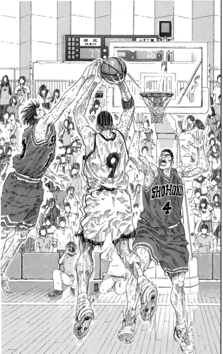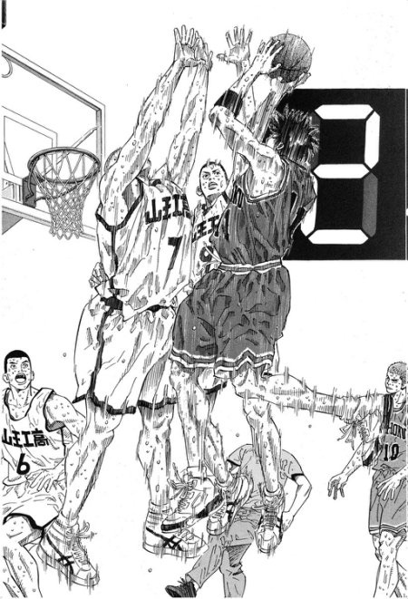 时间只剩9.4秒,山王仍在庆祝之际,坚信着比赛胜利的樱木已经朝着前场跑去,赤木欲长传却遭遇小河田防守难以传球,流川枫快速接球推进,企图在泽北和大和田的双重防守下强行后仰。